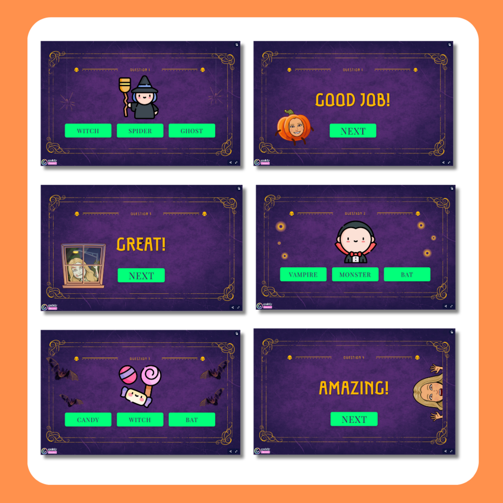 🧟 Con una de las plantillas que nos ofrece Genially, diseñaremos y adaptaremos nuestra dinámica al nivel y vocabulario de Halloween que nuestro alumnado ha ido aprendiendo mediante las anteriores actividades llevadas a cabo en clase. La dinámica es muy sencilla: en pequeños grupos o de manera individual, irán saliendo a la PDI para seleccionar la respuesta correcta del vocabulario que corresponde con la imagen que aparece. Para ello, hemos presentado siempre los mismos iconos que representan al vocabulario de Halloween en todos nuestro recursos: de esta manera será más sencillo que los reconozcan.