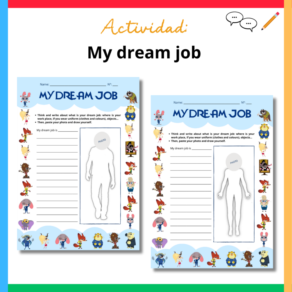 💬✏️ My dream job: individualmente, deberán de elegir su profesión soñada y representarla artísticamente en la ficha: se dibujarán y pegaremos una fotografía de su cara en la misma. Además describirán en qué consiste el trabajo y compartirán el por qué de haber elegido esa profesión. Finalmente, en asamblea, haremos balance haciendo una encuesta de los trabajos que más han sido elegidos por la clase y cuáles menos.