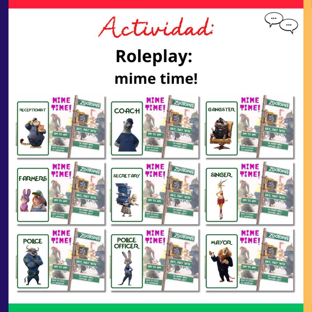 💬 Roleplay - Mime time!: cada alumno/a elegirá al azar una de las tarjetas donde aparece representados los personajes de la película con su profesión. Posteriormente, en pequeños grupos irán representando con mímica y gestos aquella profesión que le ha tocado mientras sus compañeros la tratan de adivinar. *Fichas con todos los personajes*