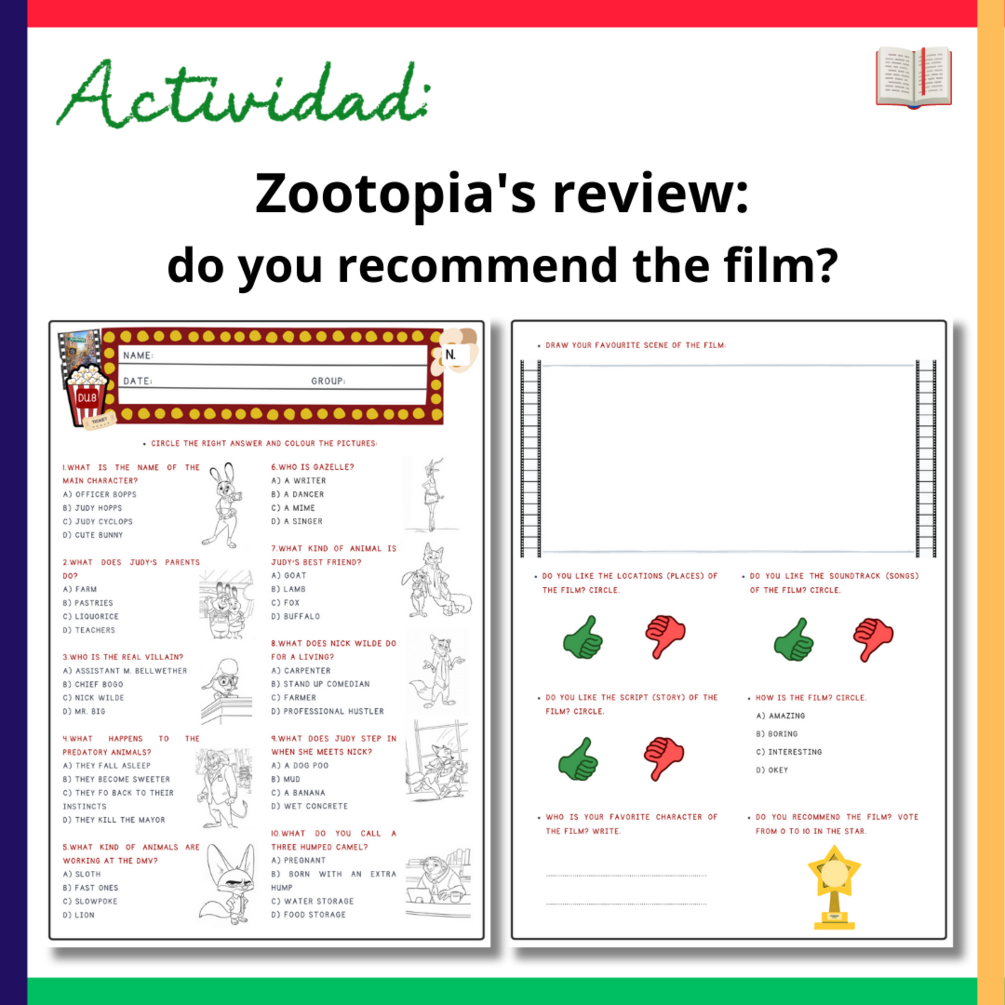 📖 Zootopia’s review: a través de esta ficha comprobaremos la comprensión lectora y de la trama de la película de nuestros alumnos. Además, podrán dibujar, valorar y puntuar según su criterio lo que le ha parecido la película.