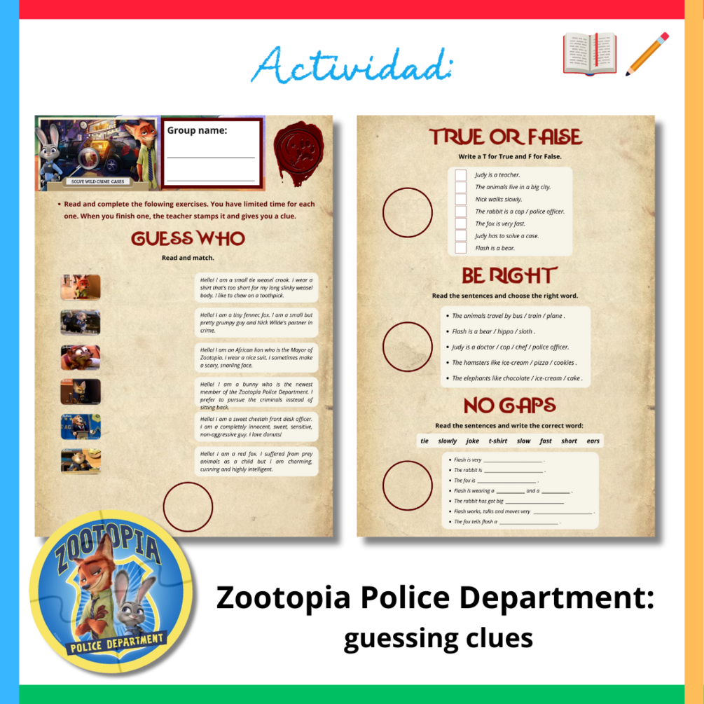 📖✏️ Zootopia Police Department - guessing clues: en pequeños grupos, deberán de trabajar como un miembro más del departamento de policía de Zootropolis consiguiendo diferentes pistas a la vez que completan los ejercicios de la ficha: guess who, true or false, be right, and no gaps. A medida que van utilizando el vocabulario y expresiones gramaticales trabajadas a lo largo de la unidad, irán consiguiendo una pieza de puzzle de la insignia oficial de policía cuando finalizan cada tarea.